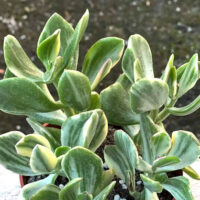 Crassula ovata ‘Variegata’, is a cream and white striped variation on the commonly known jade plant.