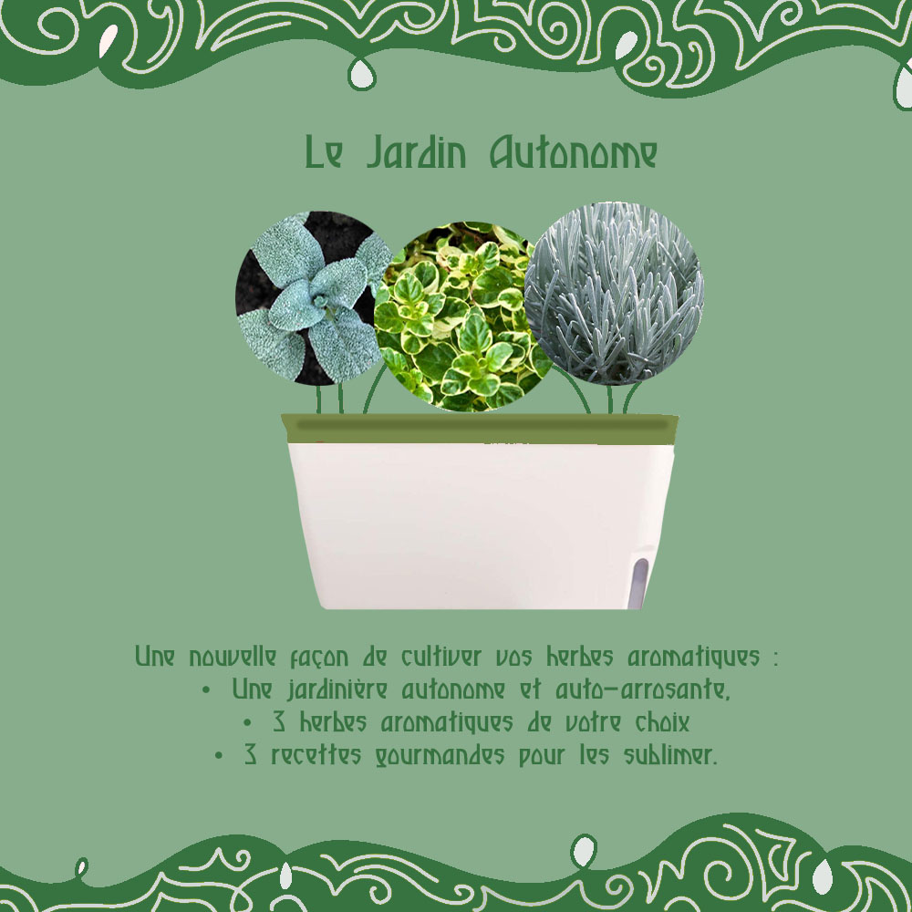 Each unit arrives ready to grow: a curated selection of one-year-old aromatic plants, a sustainable resin planter with an integrated water reservoir, and a recipe booklet to guide you on your journey.